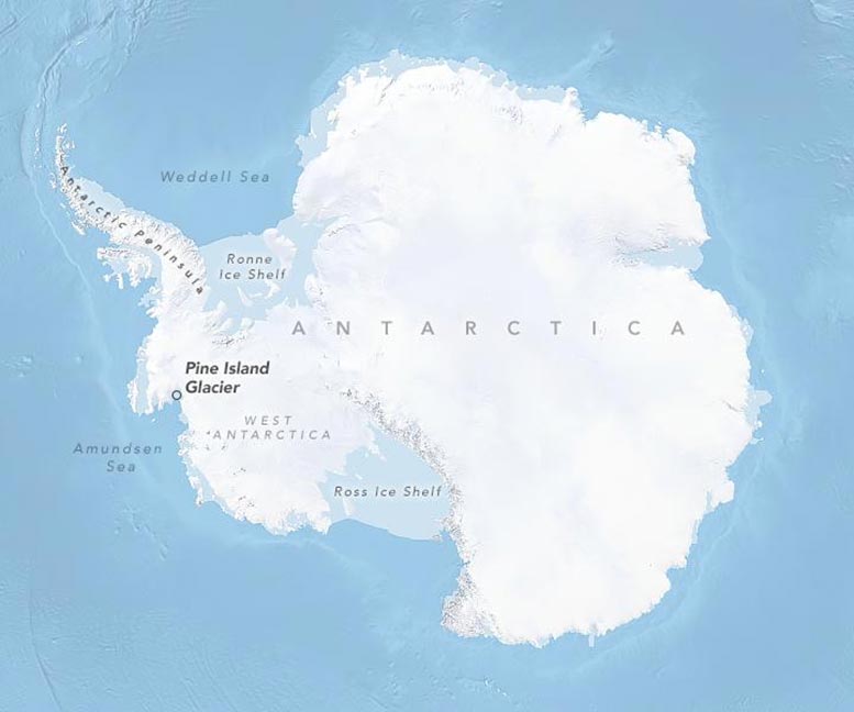 明确显示松树岛冰川地点的南极洲地图。研究人员制作了第一个基于物理学的可量化证据,即在南极洲稀释冰架造成更多冰来从陆地流入海洋。