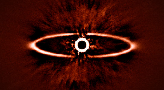 这款红外图像显示了附近星星HR 4796A周围的尘埃环,位于南部星座的矢车区。它是在2014年5月安装在ESO非常大的望远镜上的Sphere仪器的第一个由Sphere Engress制作的首批。它不仅呈现出透明度,而且还揭示了球体的力量,以减少光明的明星的眩光 - 未来寻找和研究外产的关键。